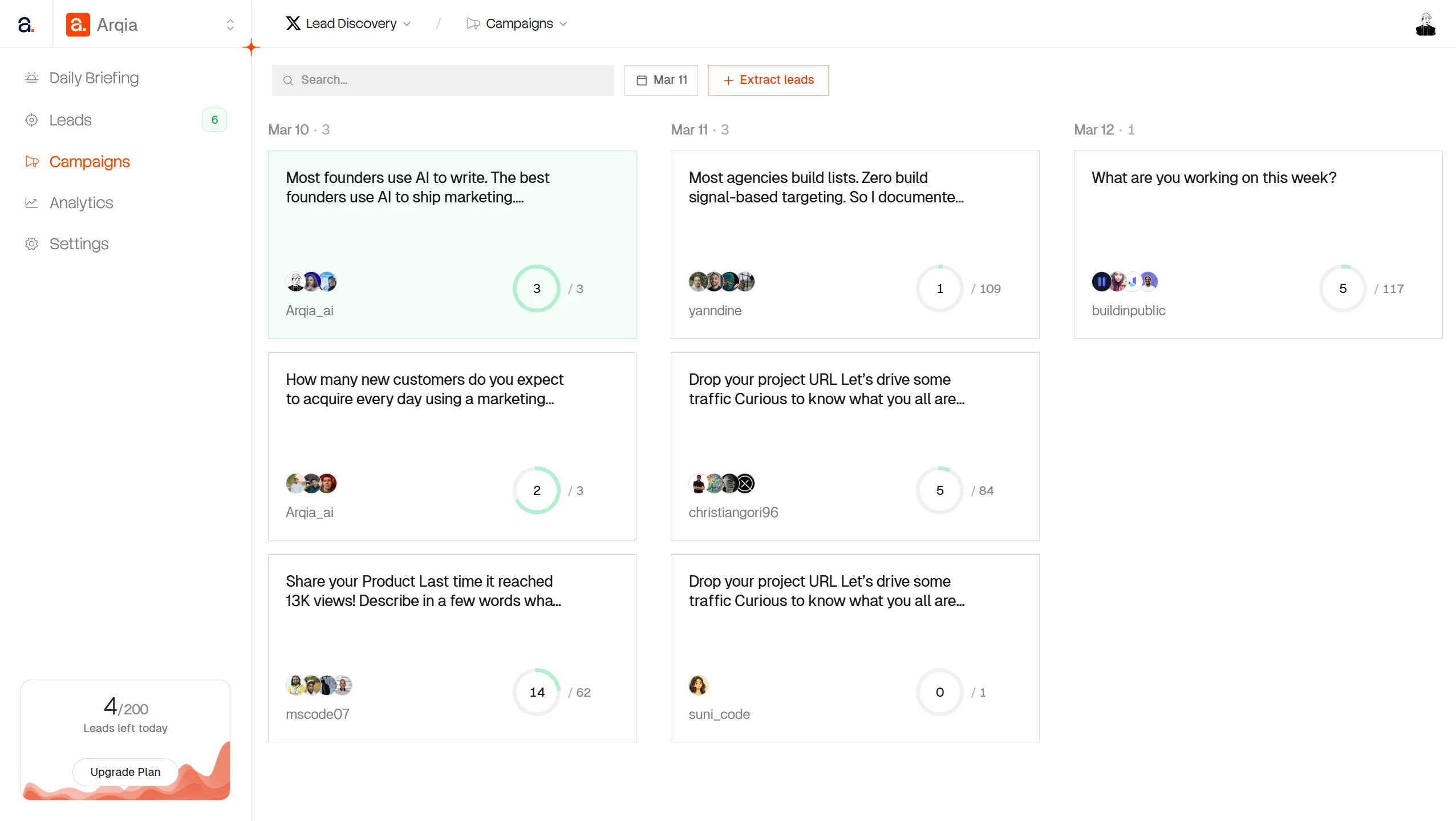 Arqia turns relevant X posts into structured lead lists by extracting authors and commenters from each post.